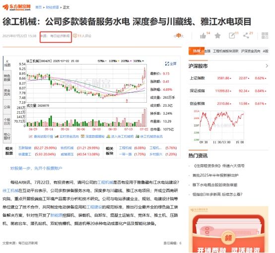 据每日经济新闻等多家财经媒体7月22日消息,徐工机械在互动平台回应投资者询问时明确表示,公司多款装备服务水电,深度参与川藏线 金牌影院,雅江水电项目,并成立西南研究院重点开展极端施工环境产品需求分析和技术研究,同日,同花顺等多款证券软件添加徐工机械“雅下水电概念股”。