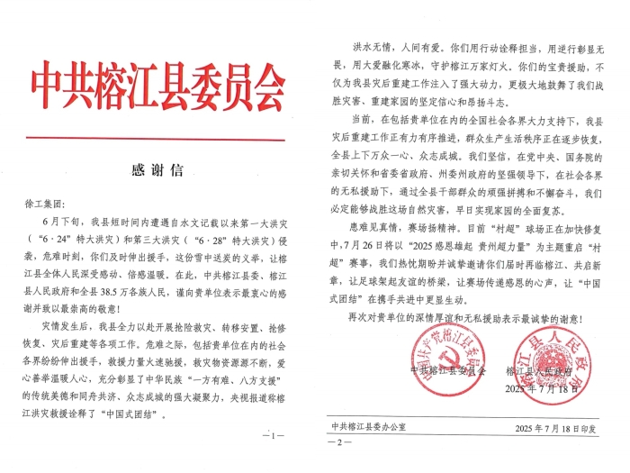7月21日,古州镇人民政府带着侗族乡亲的嘱托,将绣有“跨越千里 驰援榕江 含泪相送 恩情永记”的锦旗交到徐工救援队手中 金牌影院,感谢信里特别提到:“这份雪中送炭的义举,让榕江县全体人民深受感动,倍感温暖,”。