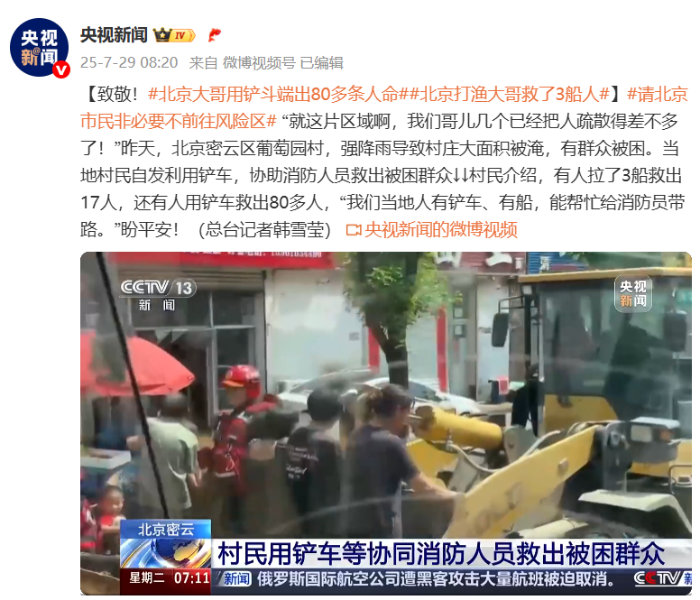 当密云区部分群众被汹涌洪水围困,命悬一线之际,铲车司机王天宇毅然驾驶徐工铲车,劈波斩浪驶入淹没区,安全转移80余名被困群众,这钢铁臂膀托举生命的震撼一幕 金牌影院,赢得了央视《新闻联播》的崇高敬意。