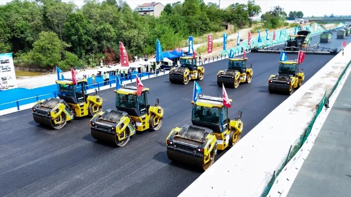 徐工智慧施工集群的应用成为破局关键,其核心亮点在于构建了一体化无人驾驶作业体系——摊铺机与压路机组成的智能施工矩阵,实现全程无人化精准作业,摊铺机依托自适应控制系统,确保摊铺精度,双钢轮压路机则凭借动态轨迹规划与压力自适应调节技术,实现碾压轨迹零偏差 金牌高清播放,压实度全域均衡,从根本上保障了路面平整度与结构强度。
