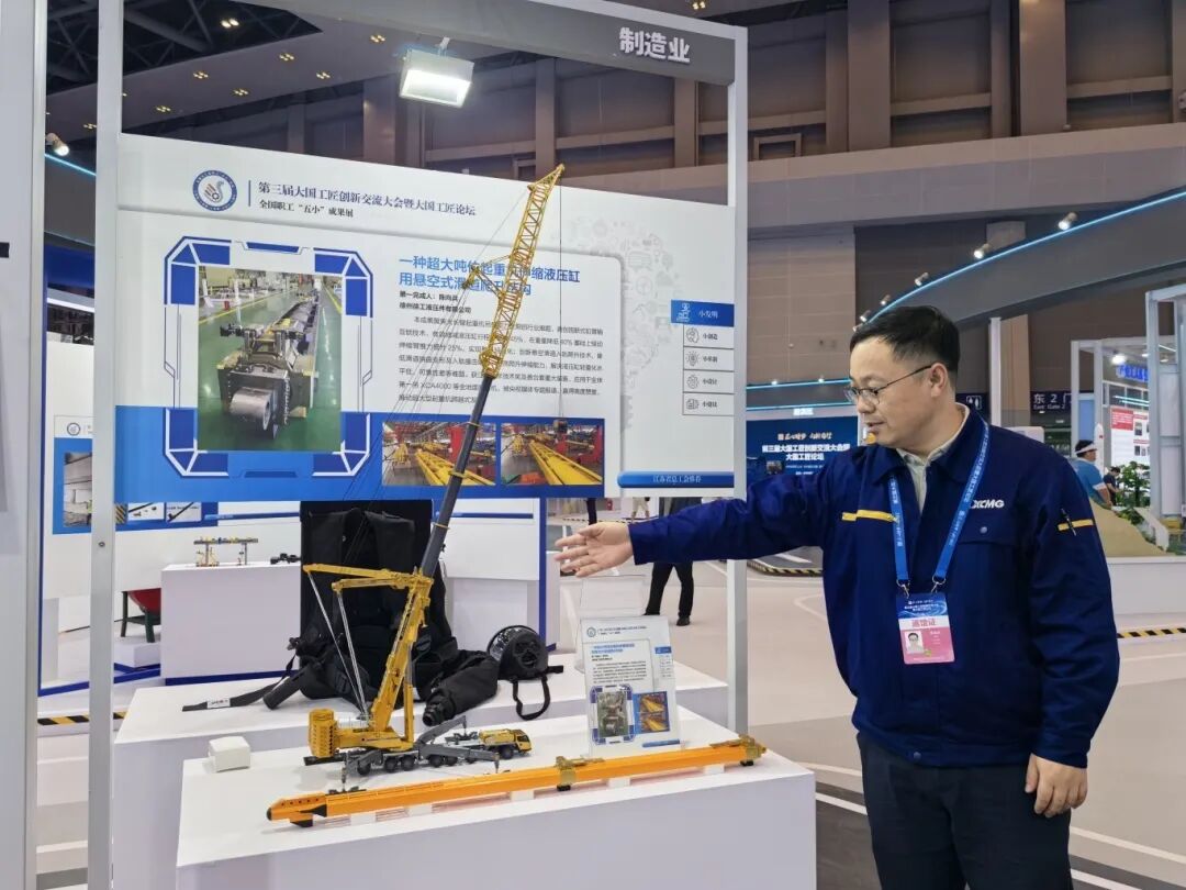 以匠心致创新,徐工人在攻克核心难题上从不缺席 在线电影平台,徐工液压事业部陈向兵完成的“一种超大吨位起重机伸缩液压缸用悬空式滑道爬升结构”亮相全国总工会“五小”成果展区。