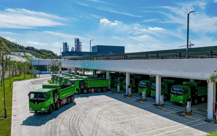 浙江省安吉县某厂区内 金牌影院,50台徐工新能源XG2 EX560T纯电动自卸车正不停作业,装卸物料,开工以来,徐工新能源自卸车以极高的工作效率和经济效益收获了用户发自内心的称赞。