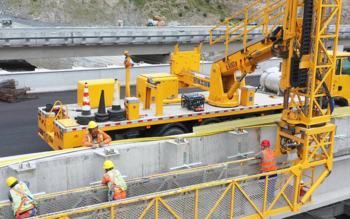 徐工桥梁检测车正稳稳托举数名工人及管材