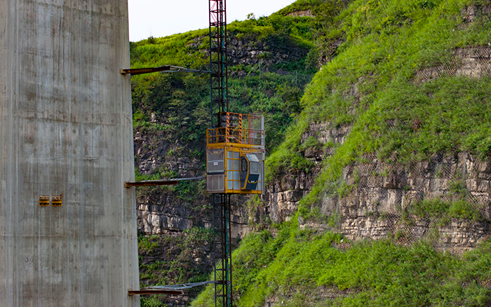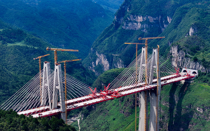 在黔中腹地悬崖峭壁间的乌长高速公路金旗特大桥项目上,徐工群塔与施工升降机协同作业,助力世界最高深山峡谷连体斜拉桥建设。
