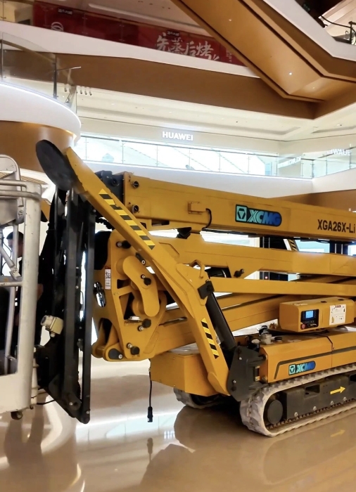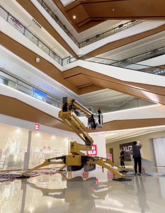 在杭州某大型商场 金牌影院,徐工XGS26X-Li将四只“蜘蛛腿”稳稳“扎根”在商场中庭,正在向玻璃围栏下方的墙壁伸展臂架,超窄车身“溜”进商场,伸缩臂架“瞄”准墙面,这是徐工蜘蛛车在商场进行维修保养的日常,而看似日常的施工,需要面对三关“难题”。