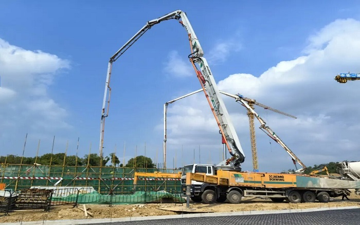 此次浇筑项目为长江军事主题文化区-中山舰博物馆关键部分,徐工以 “1+2+10+1” 成套化设备迎战:1台HB72V,2 台HB62V大米数泵车打头阵 金牌影院,10台12方新能源搅拌车,1台XGT7026-12S1塔机组成 “补给梯队”,展现“1+2+10+1 > 14”的成套化作业优势。