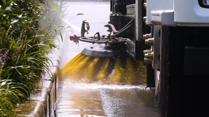 产业区周边道路:运输车辆频繁出入,易产生碎屑,油污 金牌高清播放,洗扫车搭载的高压水枪与V型喷杆,可对路面进行深度冲洗,油污去除率超95%,避免二次污染。