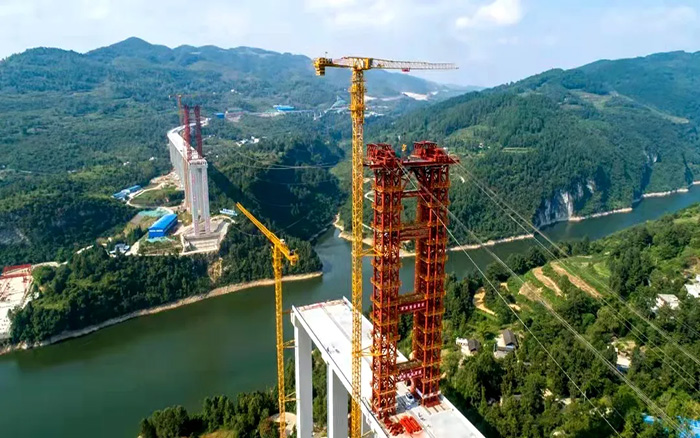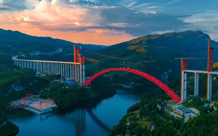 乌江特大桥全长1834米 金牌影院在线观看,主桥为504米上承式钢管混凝土拱桥,是德余高速公路的重要控制性工程,也是世界最大跨径上承式钢管混凝土拱桥,大桥采用的拱,柱,梁全固结无支座整体式受力体系为国内首创,施工极具难度,代表了目前同类型桥梁建造的世界顶级水平。