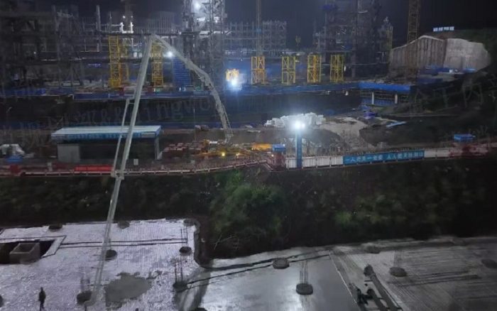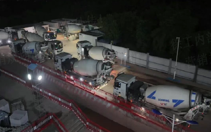 凌晨三点的重庆两江新区 金牌影院,徐工72米泵车展臂高空,20辆新能源搅拌车穿梭往来—这不是科幻电影场景,而是徐工混凝土成套化装备助建重庆赛力斯全球汽车公园的火热夜战场面。