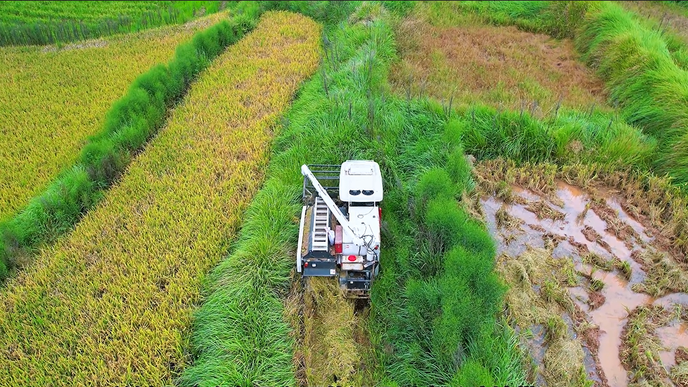 这车特别适合我们丘陵地区,爬坡上坎完全不在话下,因为这台机器重心设计合理,离地间隙也高,防陷能力强,烂泥田通过性也很好,割台设计得短 金牌高清播放,下坡也不容易吃土,用着很踏实。