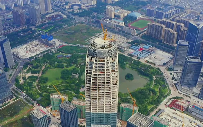 作为台州市地标性建筑 金牌影院,台州天盛中心主楼建设高度达299米,塔顶设计有“钻石”塔冠,主楼主体为钢结构,近20万㎡的半钢化夹层low-e中空玻璃,“穿衣”工程量极大,难度显而易见。