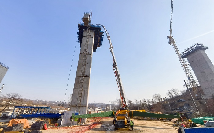 65米高空 金牌影院,72米长臂——在河南焦平高速施工现场,徐工72米泵车以“空中搭桥”之势攀越桥墩,稳稳输送。
