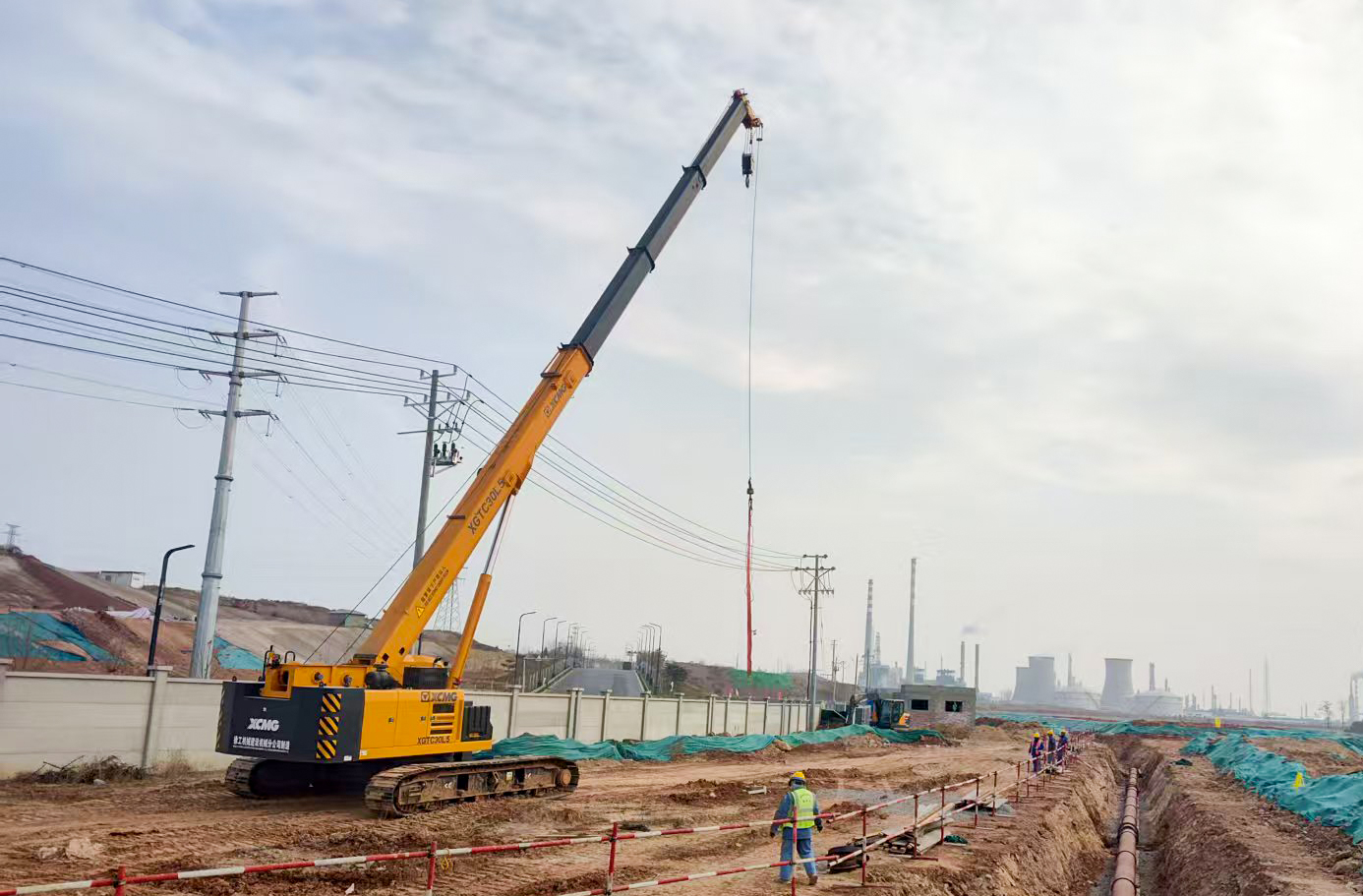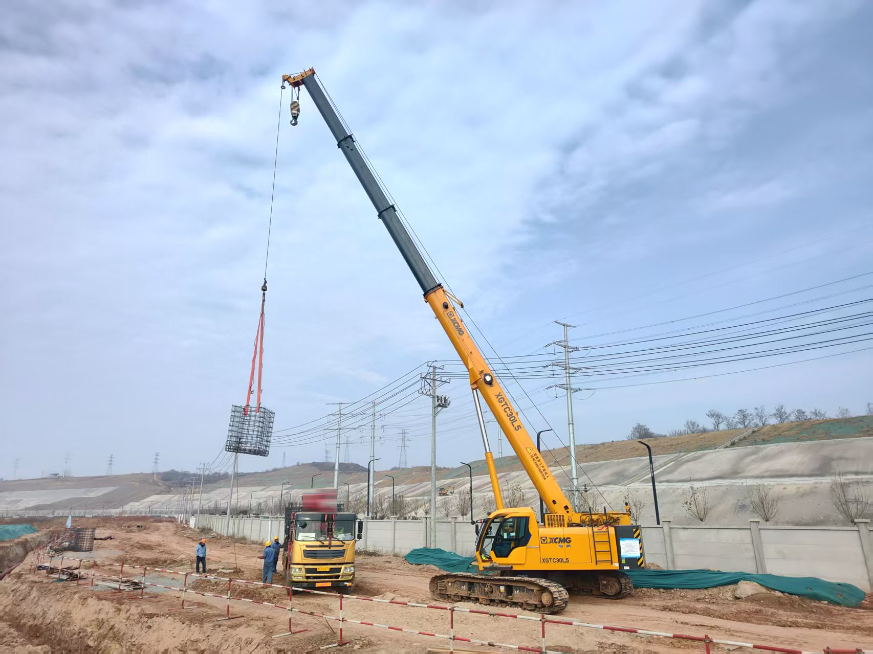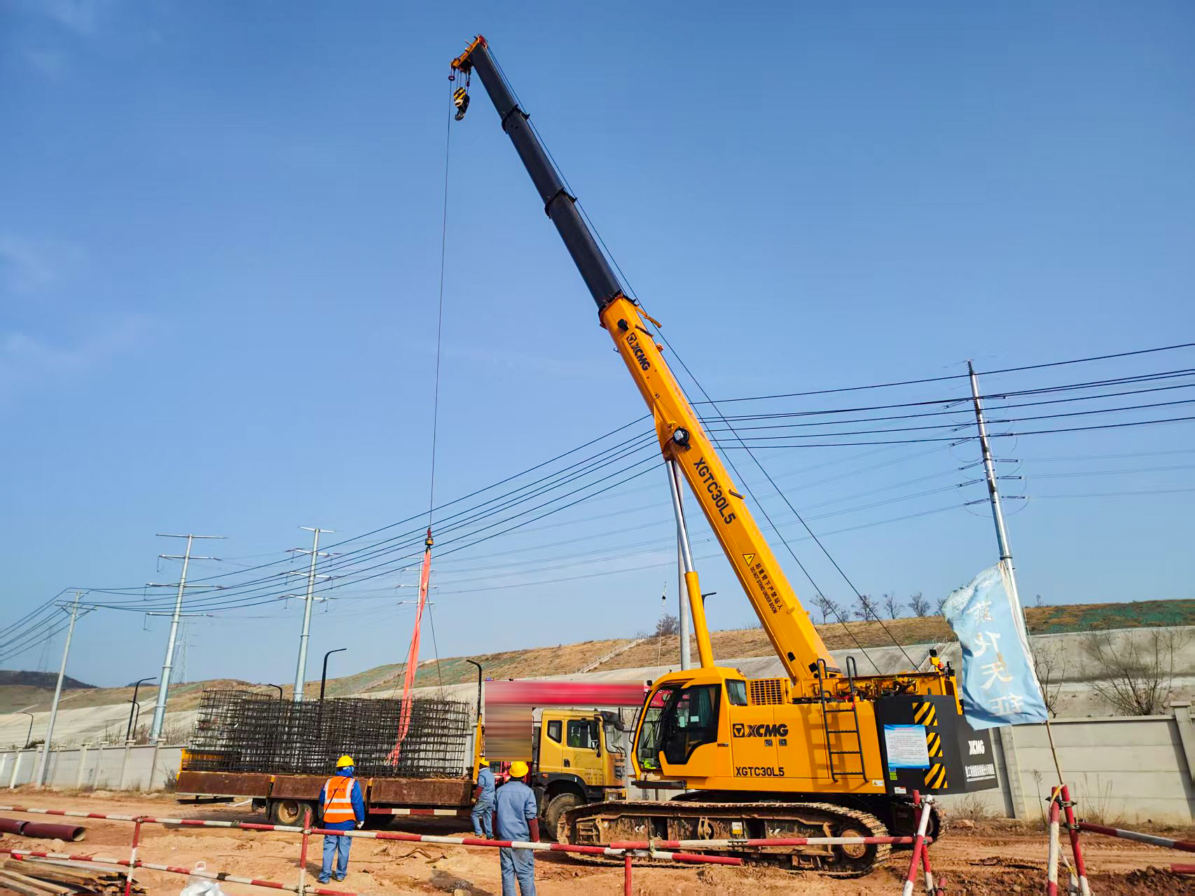 洛阳百万吨聚乙烯项目基础施工现场 金牌影院,XGTC30L5(30吨级)伸缩臂履带起重机正承担着关键工序——钢筋笼吊装。
