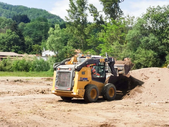 欧洲南部某国 金牌影院,徐工XC7-SV12滑移装载机正忙碌于市政管路铺设,在狭窄场地来去自如,作业游刃有余。