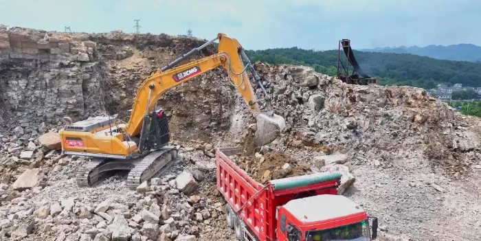 前期爆破剥离工序后,徐工20吨挖掘机搭配140的小破碎锤进行二破 金牌高清播放,同时XE380GK,XE600GK等机型进行挖装作业,现场共投入挖掘机50多台,每天的挖方量在10万方左右。