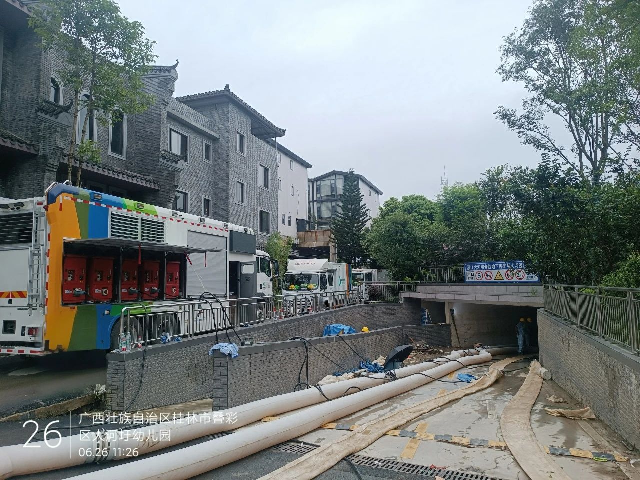 位于桂林七星区的丹桂府小区,地下车库占地面积超50000m³,高度约3,5m,也同样遭受到洪水的侵袭。来自广州排水的徐工PS50B泵组式大流量排水抢险车迅速赶来,进行定点强排作业。十余小时加大马力连续抽排积水。顺利完成任务后,该台设备又迅速赶往下一救援场地。 金牌高清播放。