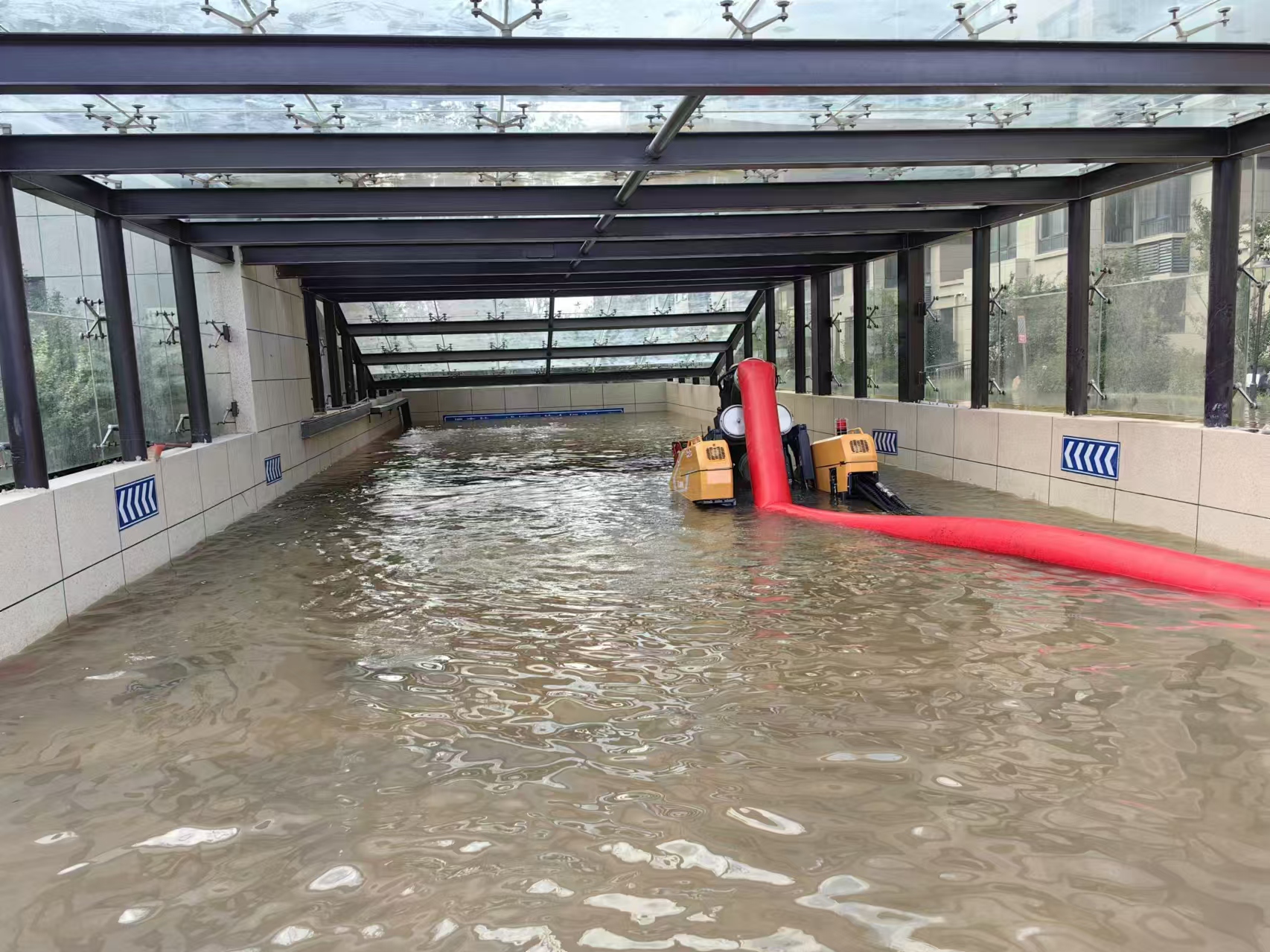 到达现场后,救援队立即开始铺设水带 金牌影视资源,检查管路,凭借子母式排涝车可实现远程分离控制的功能,救援人员将PS50F停至地下车库入口处,铺设240米超长水带,遥控子车探入斜坡30余米,水泵没入积水进行抽排水,连续工作40小时后,PS50F排除积水超80000m³,内涝隐患得到有效控制,获得现场居民一致点赞。