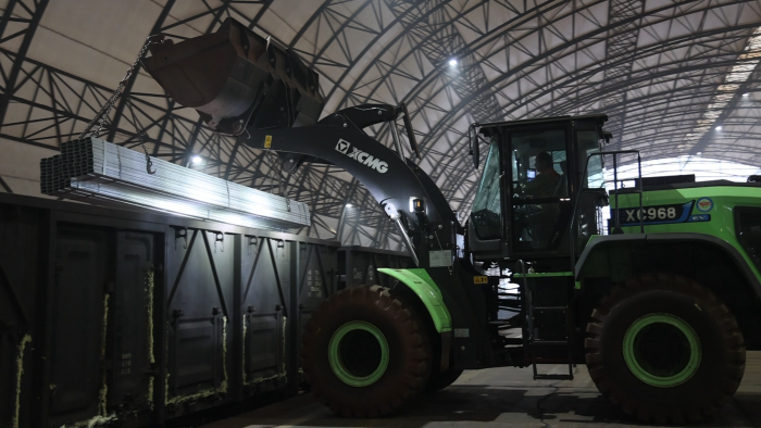 货运站台上,一台绿甲战士格外引人注目 金牌影院在线观看,这台徐工XC968-EV纯电动装载机不同以往的圆弧型大臂像极了武侠小说中的“圆月弯刀”,格外引人注目。