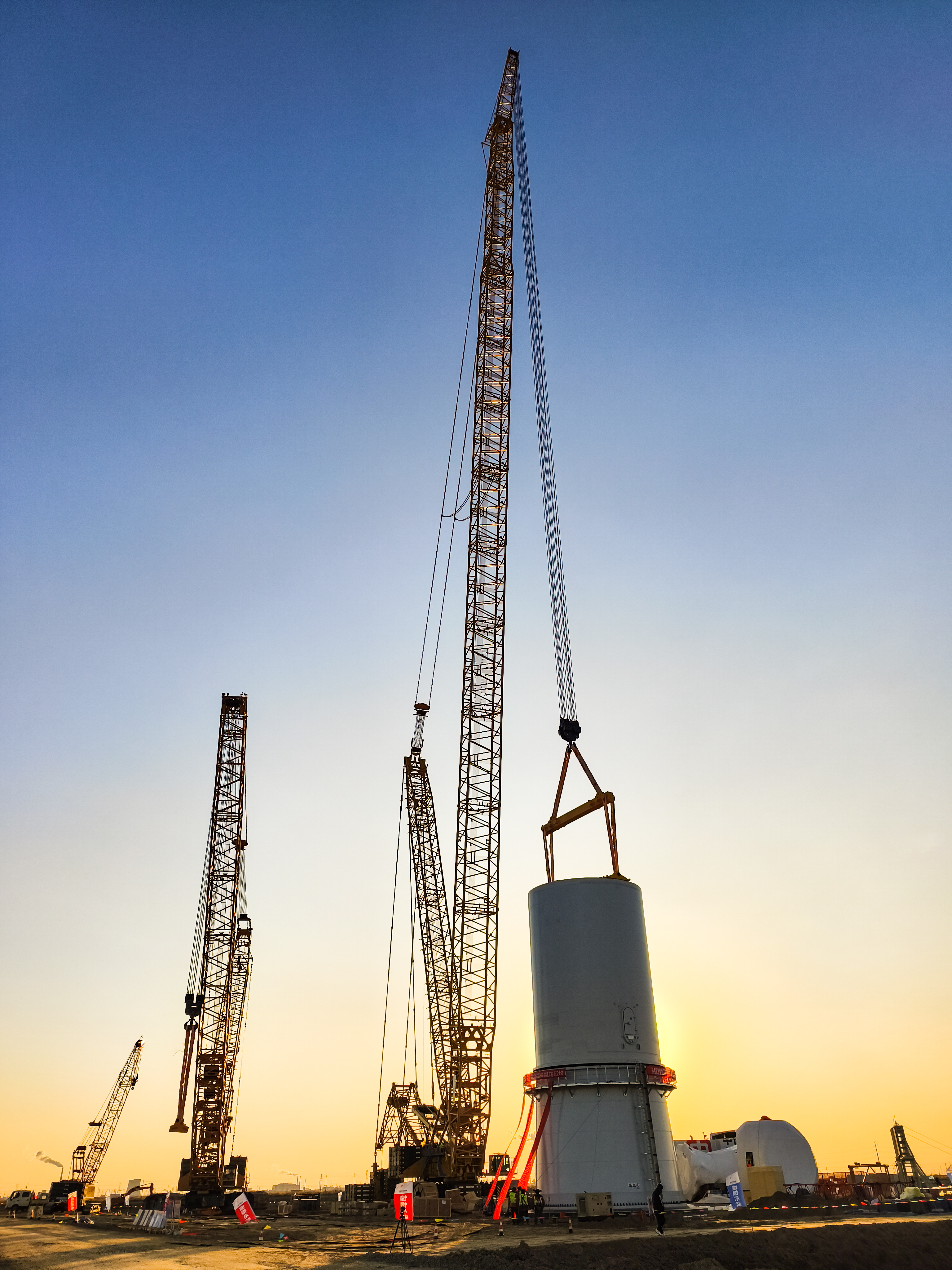施工现场,XLC18000采用156+12m超起风电工况,将长达126m的叶片平稳起吊至145m高空,与机舱精准对接,塔筒 金牌影视资源,机舱与叶轮一次就位成功。