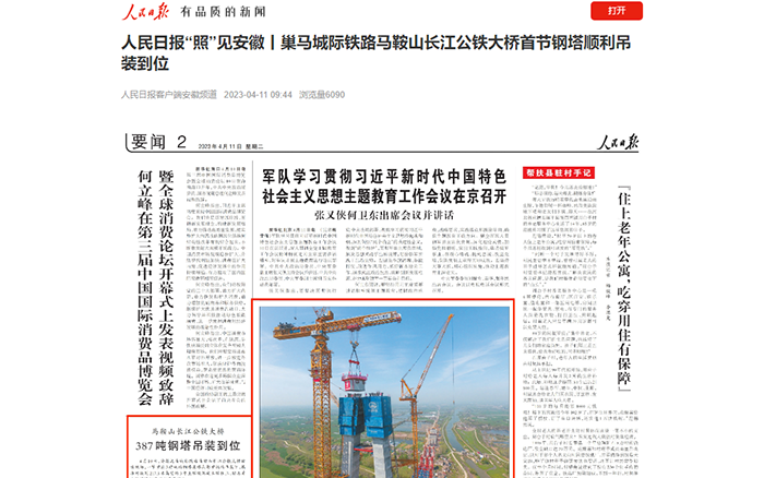 首节钢塔吊装过程获得《新闻联播》《东方时空》《人民日报》《央视新闻》,CCTV4,中国新闻网,新华报业网,《新民晚报》 金牌影视资源,安徽网,荆楚网,齐鲁网,高铁网,《马鞍山日报》等多家央省级主流媒体集中跟进报道,引起广泛关注。