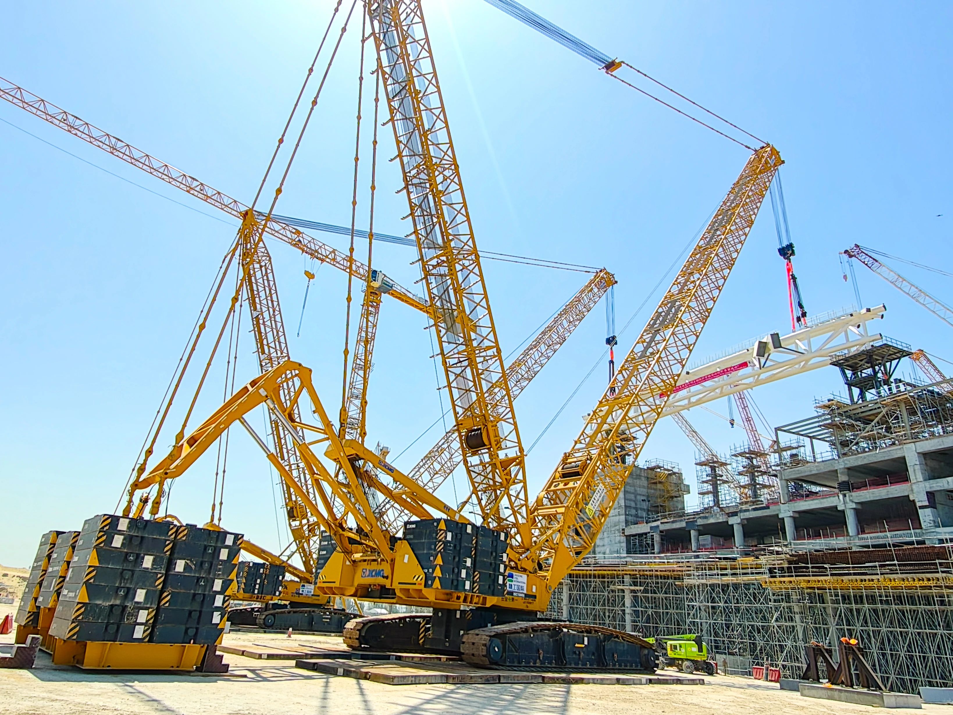 徐工两款大吨位履带式起重机——XGC15000A(1000吨级)与XGC12000(800吨级)强势出击,施工现场 金牌高清播放,XGC15000A以85米超起重型主臂应对超高作业需求,吊装过程平稳高效,XGC12000则采用84米超起重型主臂形成科学夹角,大幅提升拆装效率。