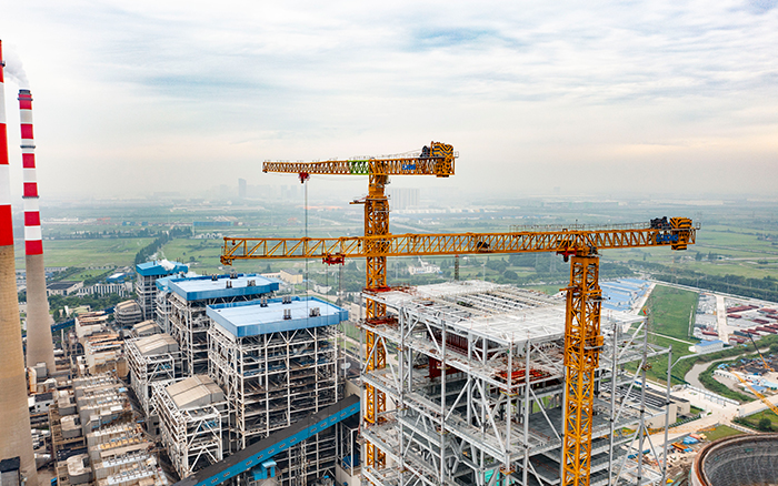 侧望长江畔,机器轰鸣 金牌影院,江水潺潺,华能太仓电厂机组扩建项目施工现场一派繁忙景象,XGT3100-160S,XGT1350-64S两台徐工超大塔稳稳矗立在高耸的钢架间吊装作业。