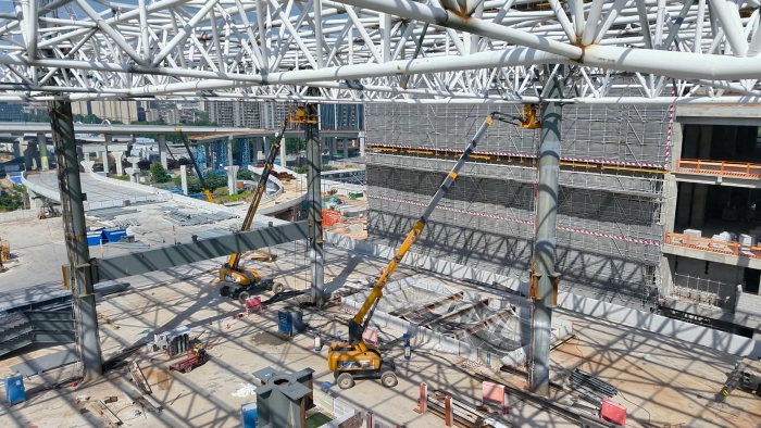 以徐工XGS40K为代表的十余台徐工高机有的“一枝独秀”,平稳变幅直指站房屋顶 金牌影视资源,有的精准定位,灵活探入桁架之间紧贴焊接点,成为保障钢桁架高空焊接作业的主力军,热火朝天的为祖国交通枢纽建设贡献力量。