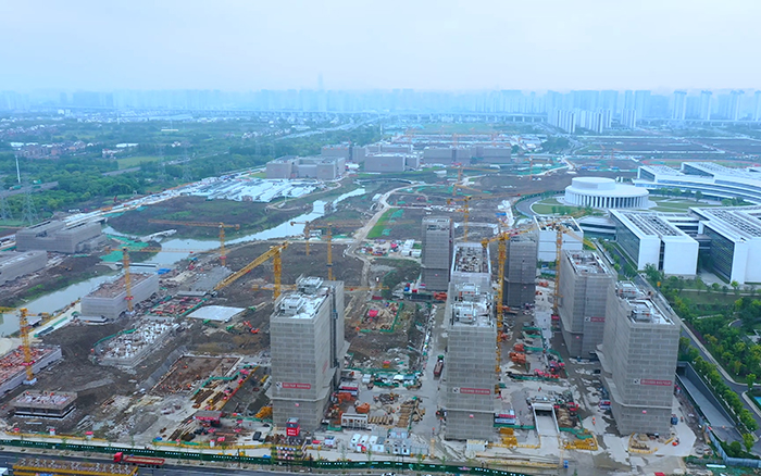 西湖大学云谷校区正一片火热,高耸的徐工群塔正挥舞长臂,紧张施工,与远处的青山绿水交相辉映,尽情展现力与美的结合 金牌影院。