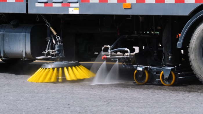 产业区周边道路:运输车辆频繁出入,易产生碎屑,油污,洗扫车搭载的高压水枪与V型喷杆,可对路面进行深度冲洗 金牌高清播放,油污去除率超95%,避免二次污染。