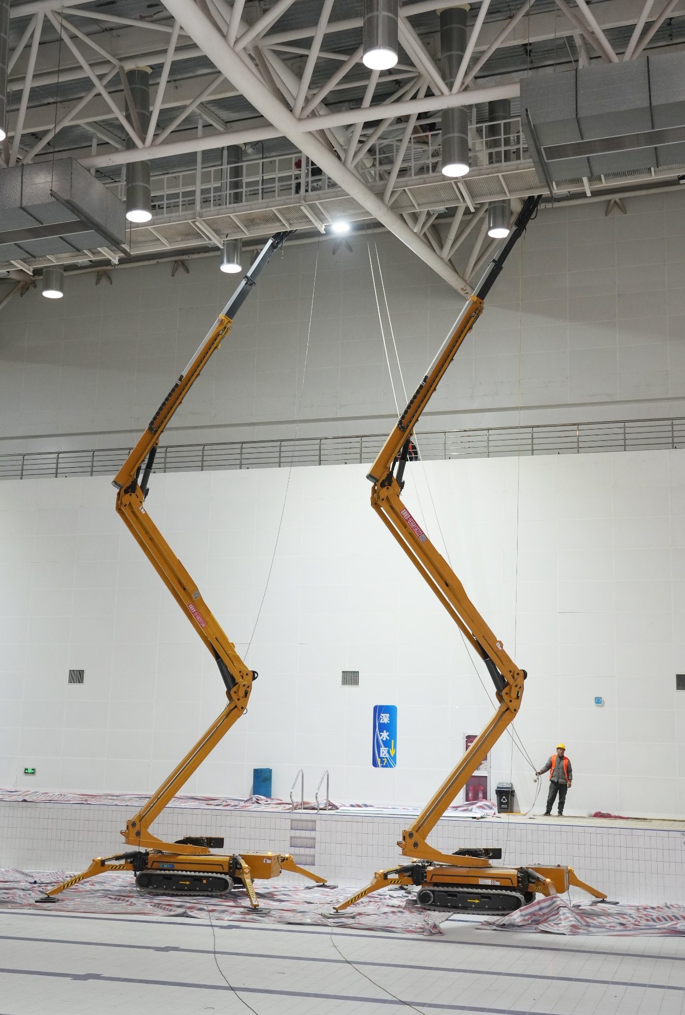 该设备采用履带式底盘,自重4 金牌影视资源,6吨,接地比压小,完美适配泳池低承重及地面保护作业;车宽仅0,99m,可灵活穿梭狭窄通道,通行无阻;工作幅度可达15m,无需频繁起降,省时高效,到场即可开工,此次施工仅配置3台设备和10名操作人员,便能高效推进任务,在保障工程质量的同时显著缩短了工期,实现了效率与成本的双重优化。。