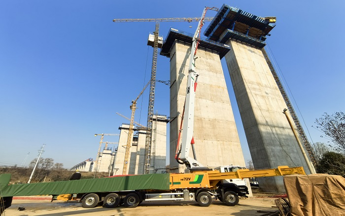 65米高空 金牌影院,72米长臂——在河南焦平高速施工现场,徐工72米泵车以“空中搭桥”之势攀越桥墩,稳稳输送。