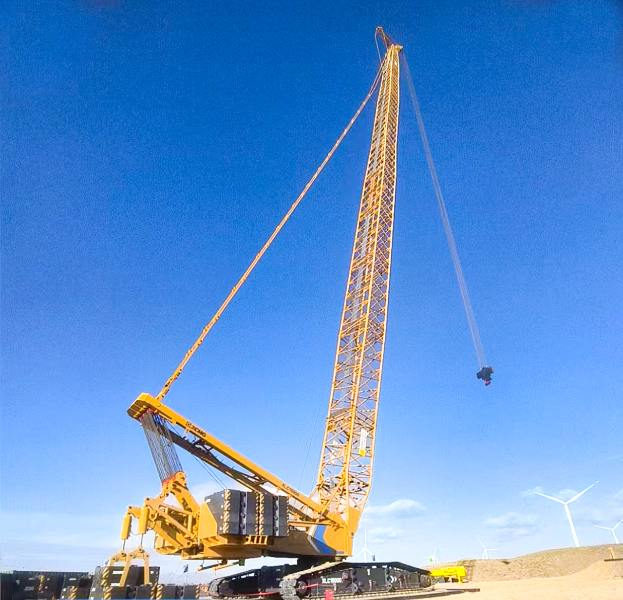 XLC15000采用超起工况,将130吨机舱稳稳送至百米高空,吊钩动态防摆技术悄然发力,重物如被无形的手托稳,毫米级精准对接塔筒法兰 金牌高清播放,风沙难扰分毫。